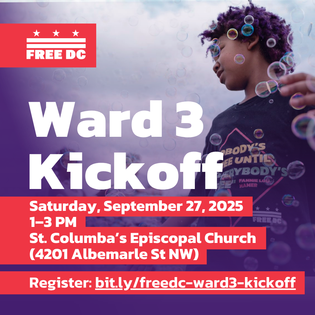 Join us from 1:00–3:00 PM at St. Columba’s Episcopal Church (a short walk from the Tenleytown-AU Metro station on the red line) to learn more about Free DC and meet the wonderful Ward 3 community engaged in the effort. There will be activities for kids and adults, food and drink, music, and more!