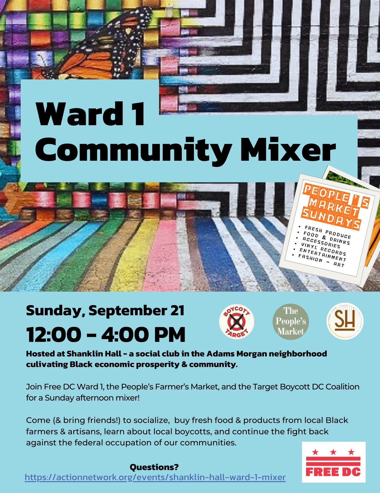 Join Free DC Ward 1, the People’s Farmer’s Market, and the Target Boycott DC Coalition for a Sunday afternoon mixer at Shanklin Hall in the Adams Morgan neighborhood.